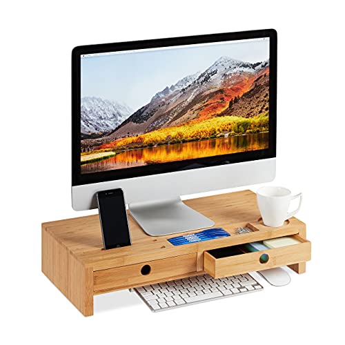 Relaxdays, Naturligt monitorstativ bambu, skärmhöjd med 2 lådor och fack, skärmstativ HBT 14 x 60 x 30 cm, standard