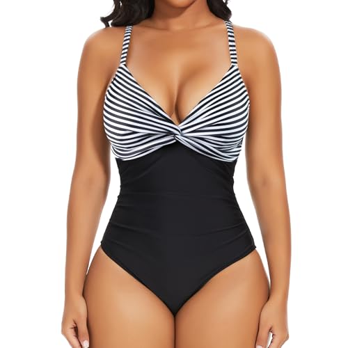SHAPERIN Endelad baddräkt för kvinnor i ett stycke med volang korsdräkter kurviga badkläder V-ringning en del monokini baddräkt tummy kontroll, Svarta ränder, S
