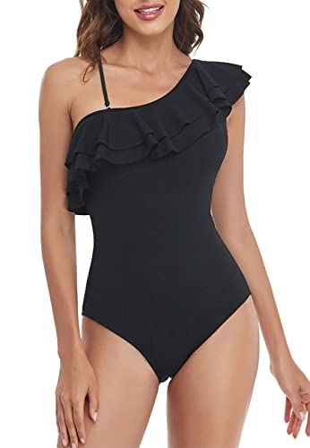 NLAND Dam volanger en axel asymmetrisk baddräkt i ett stycke bikini rygglös strandbikinis elegant monokini rymmande, svart, L