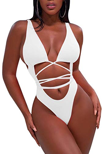 Sovoyontee Baddräkt i ett stycke för kvinnor vit med högt snitt, stringtrosor, bikini, låg rygg baddräkt, Monokini M, Vit, M