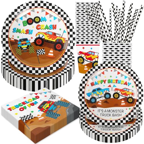BOIKOKY Monster Truck födelsedagsfest dekorationer, 120 st monster truck tema festtillbehör servis inkluderar papperstallrikar, servetter, koppar och sugrör, serverar 24