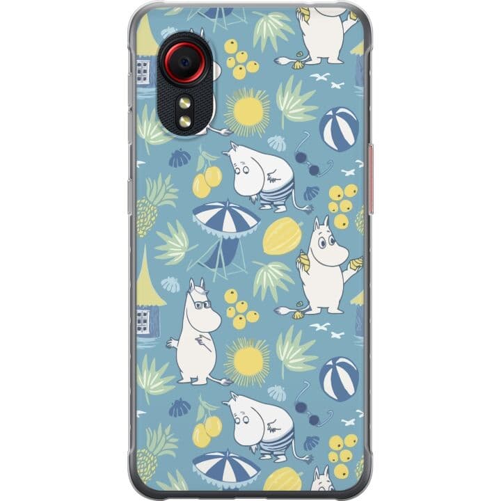 Samsung Galaxy Xcover 5 Genomskinligt Skal Strandtema med frukter, parasoller, sommarhus och glada figurer i färgglatt mönster fyllt av lekfulla deta