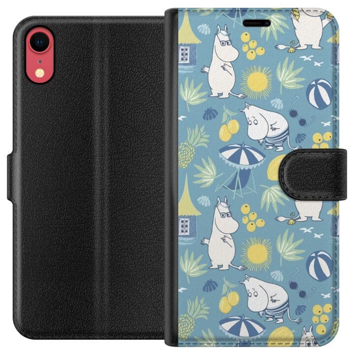 Apple iPhone XR Plånboksfodral Strandtema med frukter, parasoller, sommarhus och glada figurer i färgglatt mönster fyllt av lekfulla detaljer och var