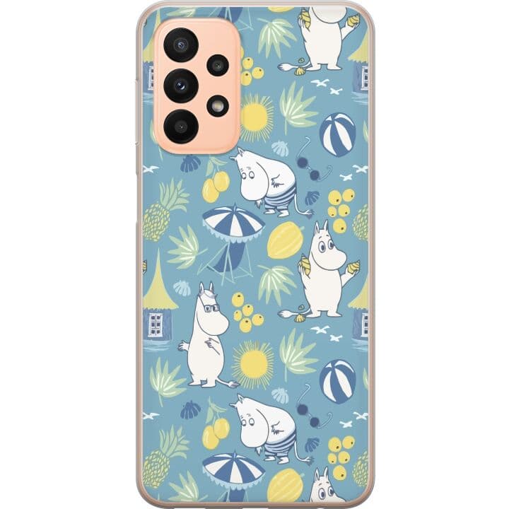 Samsung Galaxy A23 Genomskinligt Skal Strandtema med frukter, parasoller, sommarhus och glada figurer i färgglatt mönster fyllt av lekfulla detaljer