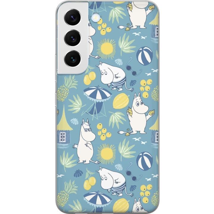 Samsung Galaxy S22 5G Genomskinligt Skal Strandtema med frukter, parasoller, sommarhus och glada figurer i färgglatt mönster fyllt av lekfulla detalj