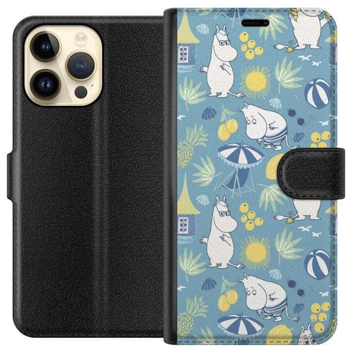 Apple iPhone 14 Pro Max Plånboksfodral Strandtema med frukter, parasoller, sommarhus och glada figurer i färgglatt mönster fyllt av lekfulla detaljer