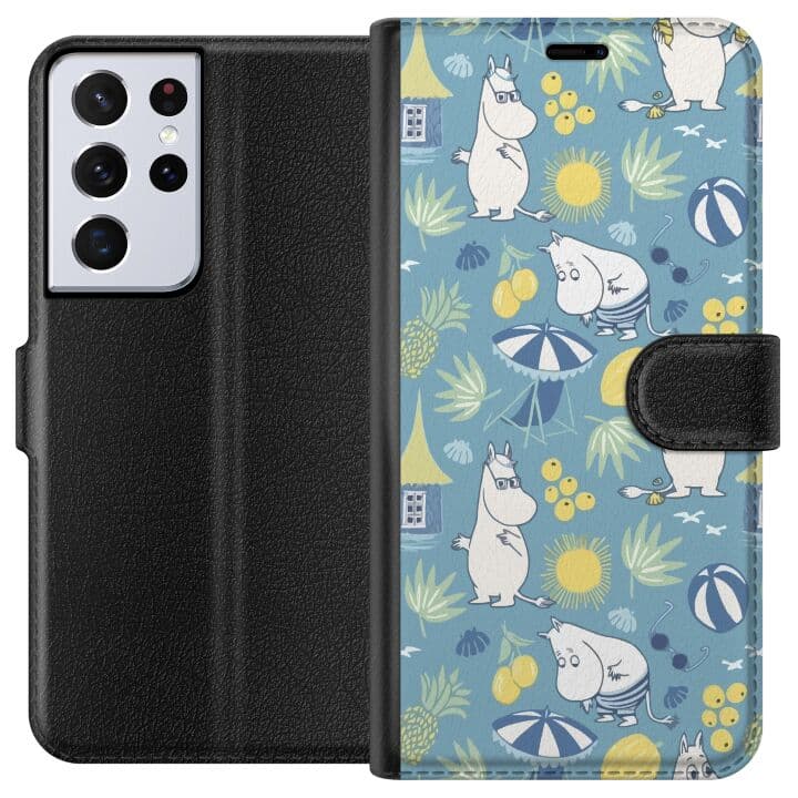 Samsung Galaxy S21 Ultra 5G Plånboksfodral Strandtema med frukter, parasoller, sommarhus och glada figurer i färgglatt mönster fyllt av lekfulla deta