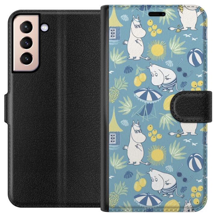 Samsung Galaxy S21 Plånboksfodral Strandtema med frukter, parasoller, sommarhus och glada figurer i färgglatt mönster fyllt av lekfulla detaljer och