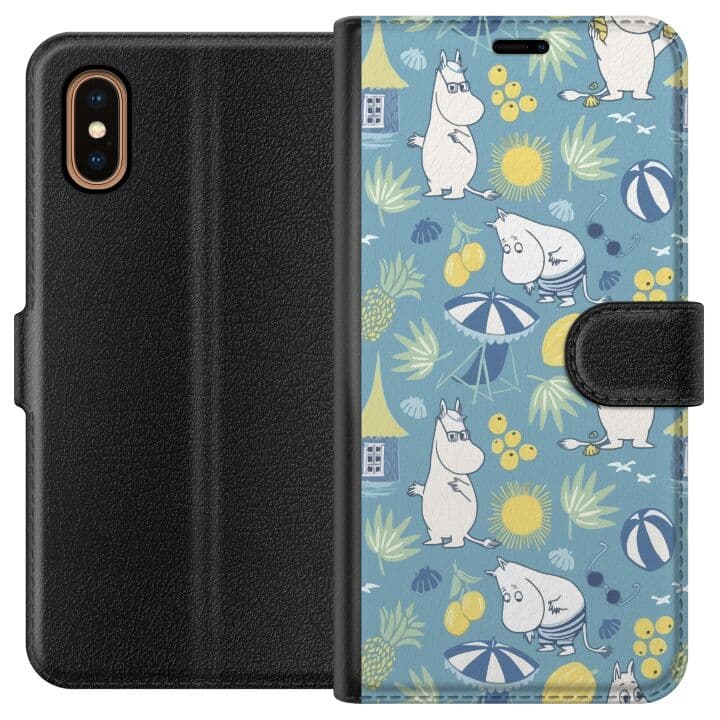 Apple iPhone XS Max Plånboksfodral Strandtema med frukter, parasoller, sommarhus och glada figurer i färgglatt mönster fyllt av lekfulla detaljer och