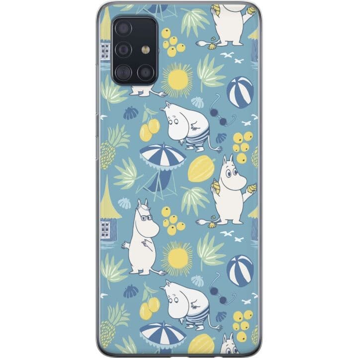Samsung Galaxy A51 Genomskinligt Skal Strandtema med frukter, parasoller, sommarhus och glada figurer i färgglatt mönster fyllt av lekfulla detaljer