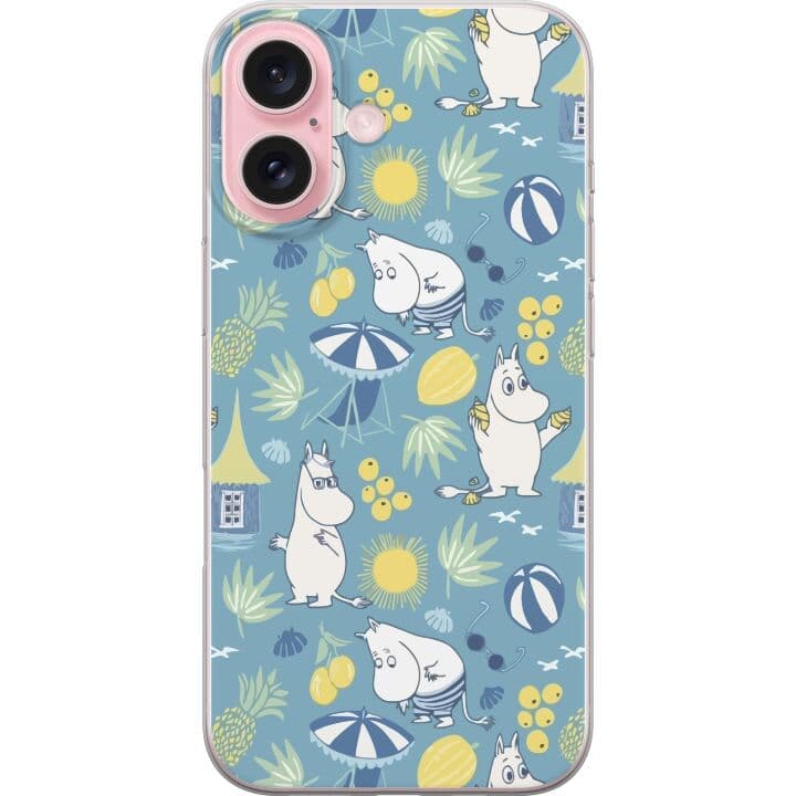 Apple iPhone 16 Genomskinligt Skal Strandtema med frukter, parasoller, sommarhus och glada figurer i färgglatt mönster fyllt av lekfulla detaljer och