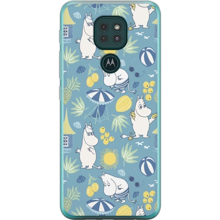 Motorola Moto G9 Play Genomskinligt Skal Strandtema med frukter, parasoller, sommarhus och glada figurer i färgglatt mönster fyllt av lekfulla detalj