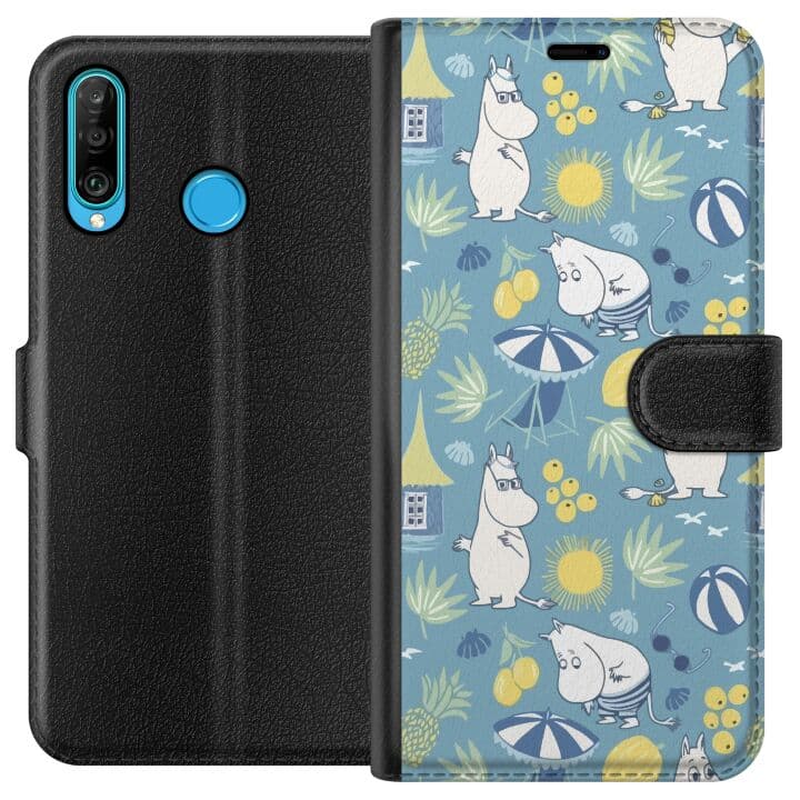 Huawei P30 lite Plånboksfodral Strandtema med frukter, parasoller, sommarhus och glada figurer i färgglatt mönster fyllt av lekfulla detaljer och var