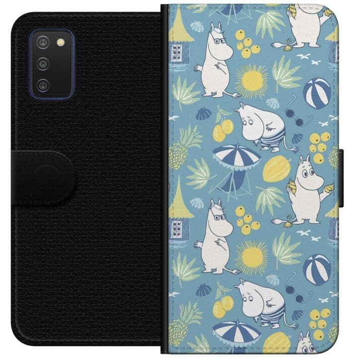 Samsung Galaxy A03s Plånboksfodral Strandtema med frukter, parasoller, sommarhus och glada figurer i färgglatt mönster fyllt av lekfulla detaljer och