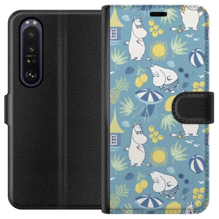 Sony Xperia 1 III Plånboksfodral Strandtema med frukter, parasoller, sommarhus och glada figurer i färgglatt mönster fyllt av lekfulla detaljer och v