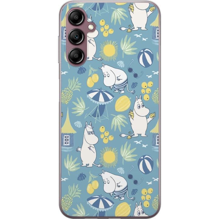 Samsung Galaxy A14 5G Genomskinligt Skal Strandtema med frukter, parasoller, sommarhus och glada figurer i färgglatt mönster fyllt av lekfulla detalj