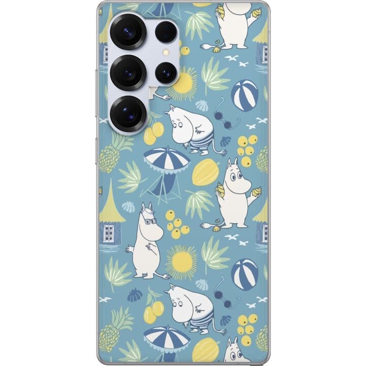 Samsung Galaxy S25 Ultra Genomskinligt Skal Strandtema med frukter, parasoller, sommarhus och glada figurer i färgglatt mönster fyllt av lekfulla det