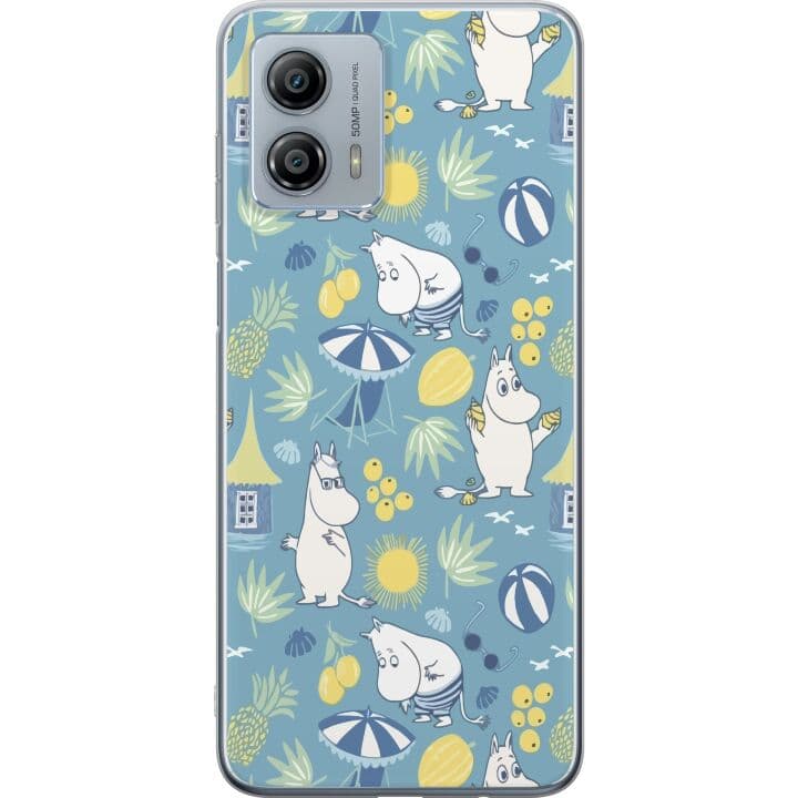 Motorola Moto G53 Genomskinligt Skal Strandtema med frukter, parasoller, sommarhus och glada figurer i färgglatt mönster fyllt av lekfulla detaljer o