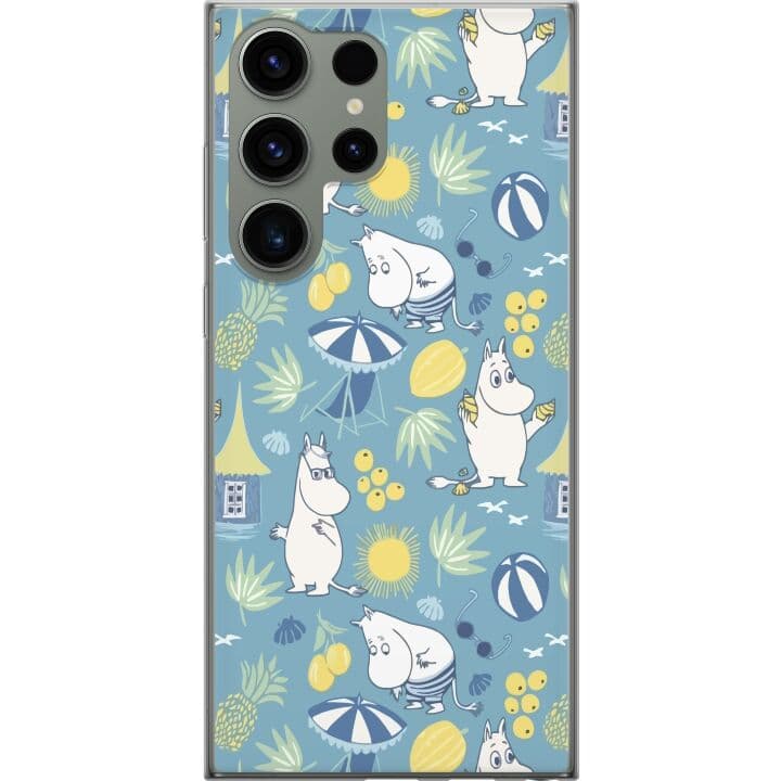 Samsung Galaxy S23 Ultra Genomskinligt Skal Strandtema med frukter, parasoller, sommarhus och glada figurer i färgglatt mönster fyllt av lekfulla det