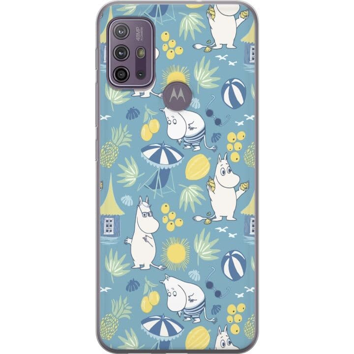 Motorola Moto G10 Genomskinligt Skal Strandtema med frukter, parasoller, sommarhus och glada figurer i färgglatt mönster fyllt av lekfulla detaljer o