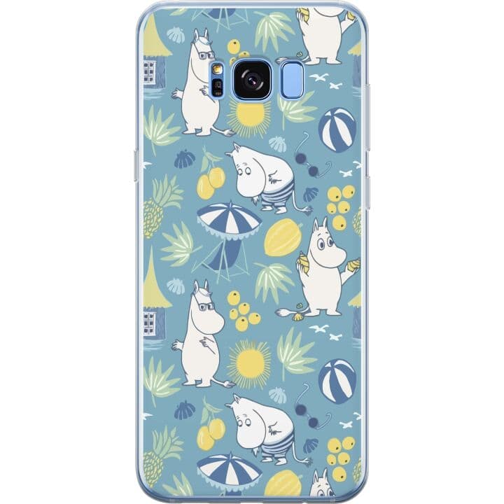 Samsung Galaxy S8+ Genomskinligt Skal Strandtema med frukter, parasoller, sommarhus och glada figurer i färgglatt mönster fyllt av lekfulla detaljer