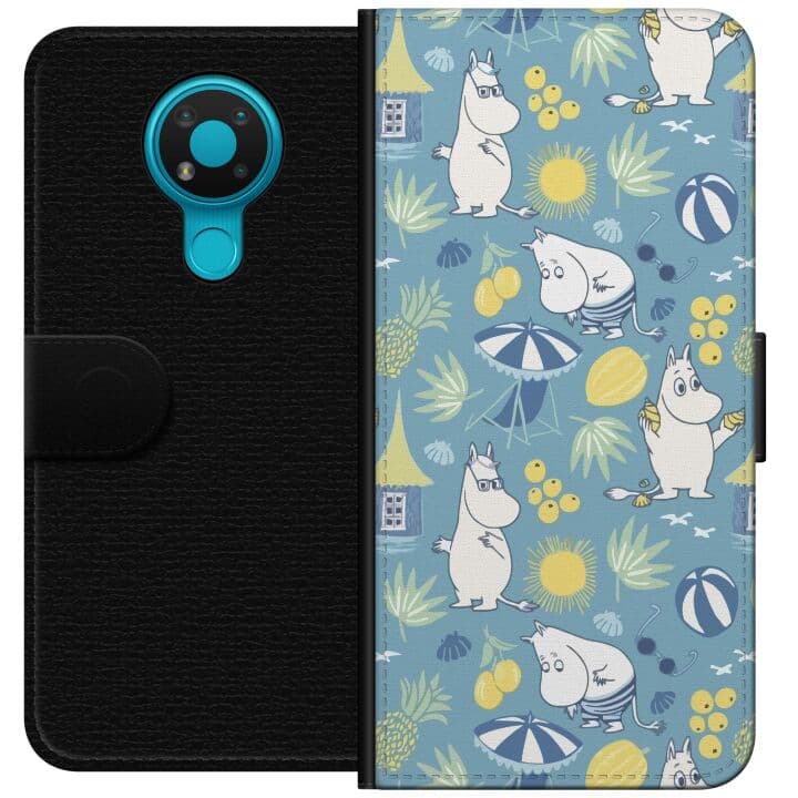 Nokia 3.4 Plånboksfodral Strandtema med frukter, parasoller, sommarhus och glada figurer i färgglatt mönster fyllt av lekfulla detaljer och varm somm