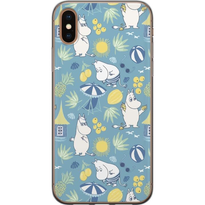 Apple iPhone XS Max Genomskinligt Skal Strandtema med frukter, parasoller, sommarhus och glada figurer i färgglatt mönster fyllt av lekfulla detaljer