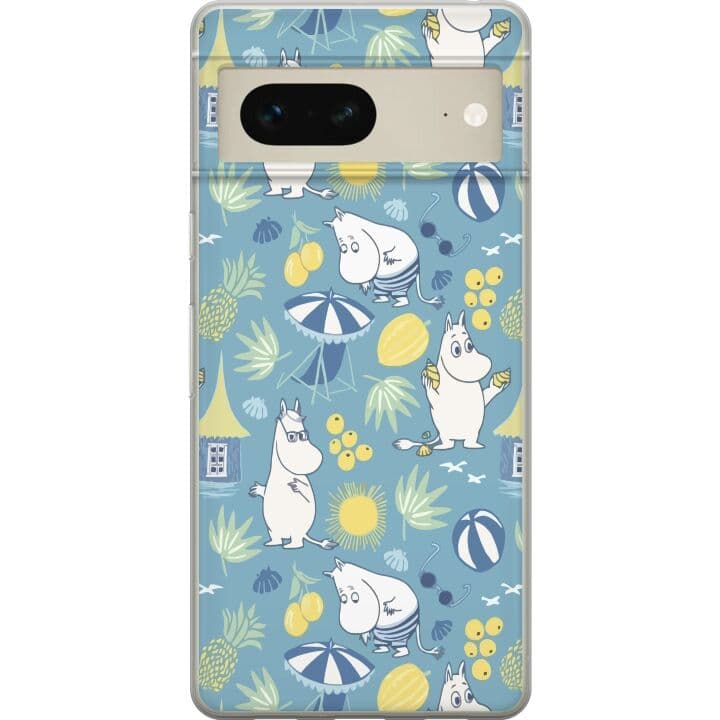 Google Pixel 7 Genomskinligt Skal Strandtema med frukter, parasoller, sommarhus och glada figurer i färgglatt mönster fyllt av lekfulla detaljer och