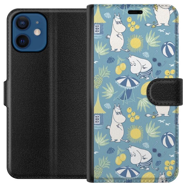 Apple iPhone 12 Plånboksfodral Strandtema med frukter, parasoller, sommarhus och glada figurer i färgglatt mönster fyllt av lekfulla detaljer och va