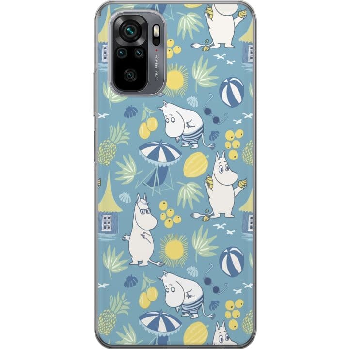 Xiaomi Redmi Note 10 Genomskinligt Skal Strandtema med frukter, parasoller, sommarhus och glada figurer i färgglatt mönster fyllt av lekfulla detalje