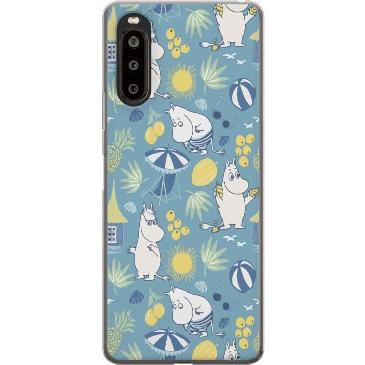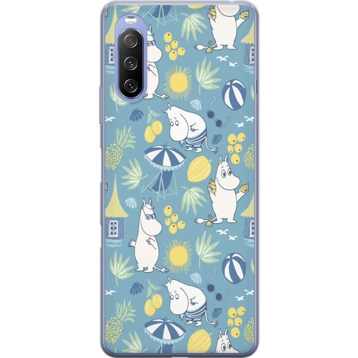 Sony Xperia 10 III Lite Genomskinligt Skal Strandtema med frukter, parasoller, sommarhus och glada figurer i färgglatt mönster fyllt av lekfulla deta