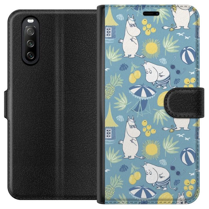 Sony Xperia 10 III Plånboksfodral Strandtema med frukter, parasoller, sommarhus och glada figurer i färgglatt mönster fyllt av lekfulla detaljer och