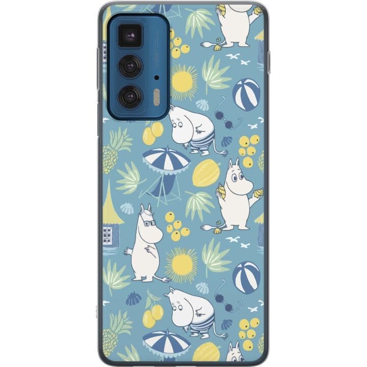Motorola Edge 20 Pro Genomskinligt Skal Strandtema med frukter, parasoller, sommarhus och glada figurer i färgglatt mönster fyllt av lekfulla detalje