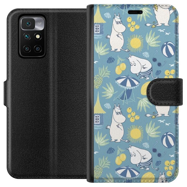 Xiaomi Redmi 10 Plånboksfodral Strandtema med frukter, parasoller, sommarhus och glada figurer i färgglatt mönster fyllt av lekfulla detaljer och var
