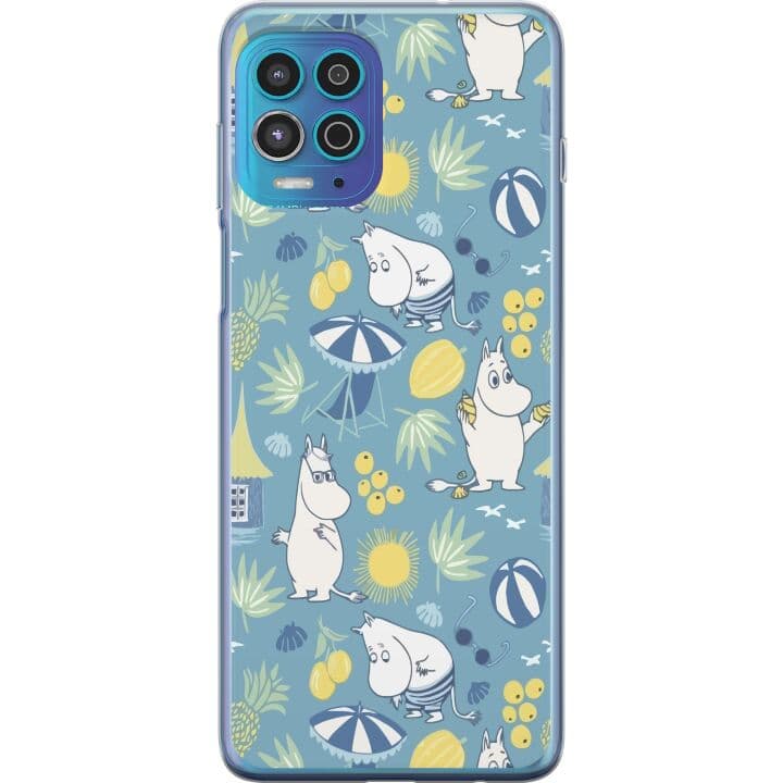 Motorola Moto G100 Genomskinligt Skal Strandtema med frukter, parasoller, sommarhus och glada figurer i färgglatt mönster fyllt av lekfulla detaljer