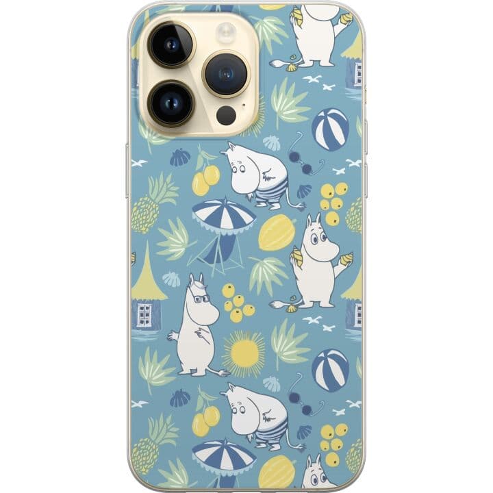 Apple iPhone 14 Pro Max Genomskinligt Skal Strandtema med frukter, parasoller, sommarhus och glada figurer i färgglatt mönster fyllt av lekfulla deta