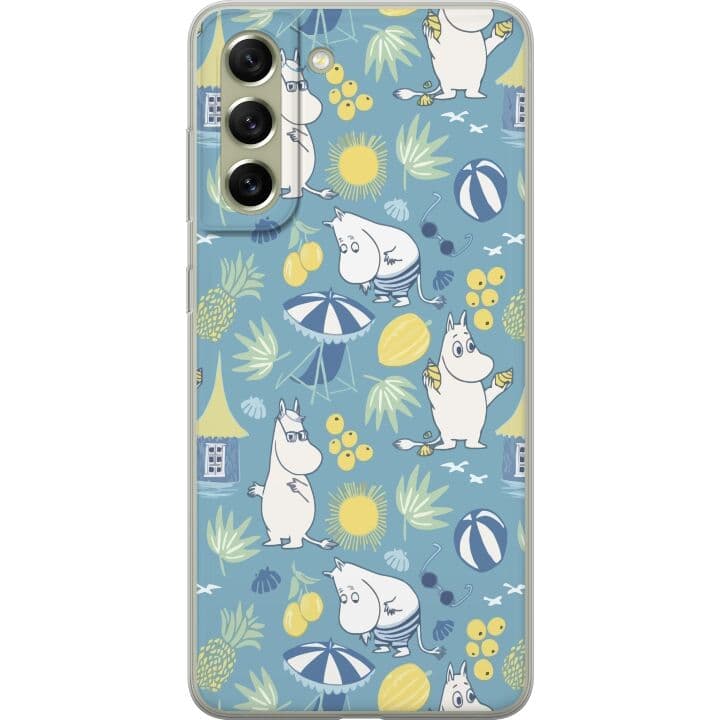 Samsung Galaxy S21 FE 5G Genomskinligt Skal Strandtema med frukter, parasoller, sommarhus och glada figurer i färgglatt mönster fyllt av lekfulla det