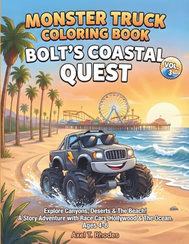 Monster Truck Coloring Book: Bolt’s Coastal Quest (Vol. 3): Explore Canyons, Deserts & The Beach! A Story Adventure with Race Cars, Hollywood & The Ocean for Kids Ages 4-8
