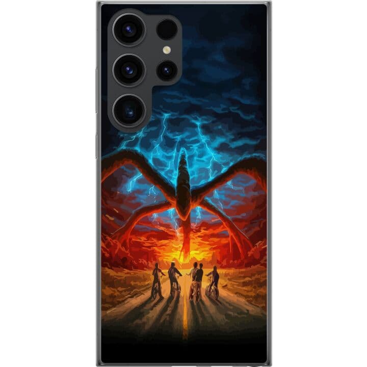 Kompatibelt Mobilskal till Samsung Galaxy S24 Ultra Dramatisk fantasibild med enormt monster, blixtar och cyklande barn mot glödande horisont