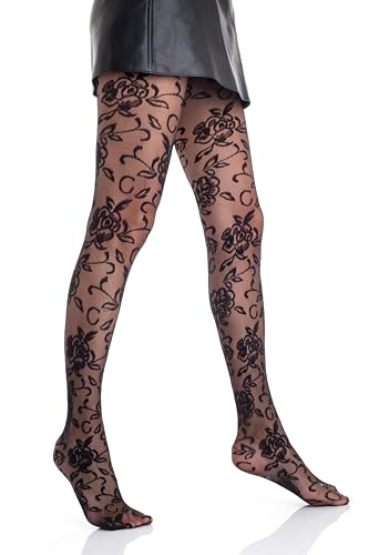 Gi&Gi Blommiga mönstrade strumpbyxor, dam blommig ton-i-ton spets tights. 40 Denier N.1464, Svart, S-M