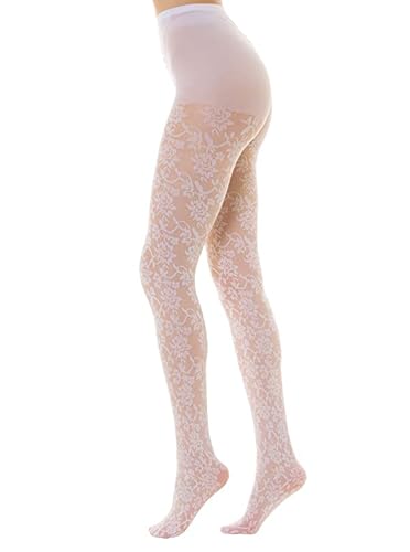 Gi&Gi Blommiga mönstrade strumpbyxor, dam blommig ton-i-ton spets tights. 40 Denier N.1464, Vit, L-XL