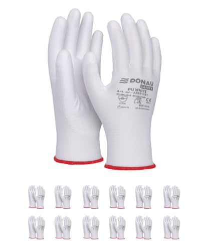 DONAU SAFETY monteringshandskar handskar/storlek 08, 12 par/katt. II/vit/handskar arbetshandskar av polyester/polyuretan/trädgård, byggare, mekaniker