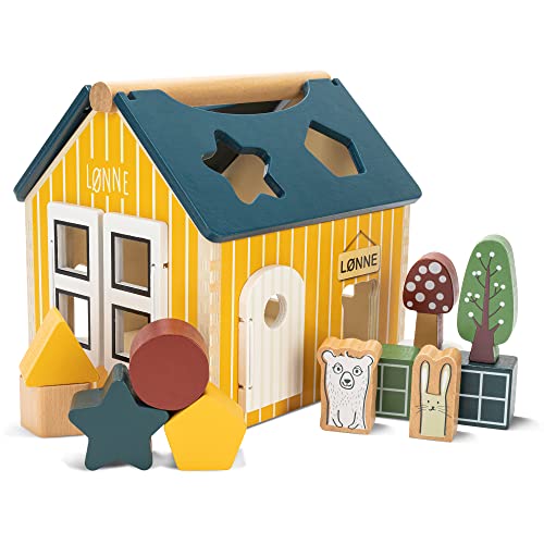 HEJ LØNNE Träskåpa med 12 träbyggstenar – Montessori-leksak för att främja motoriska färdigheter och koordination – plugghus från 1 år – motorikleksaker
