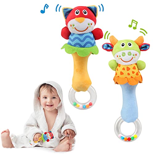 LEADSTAR Nyfödd skallra, 2 st plyschleksak bebis skallror spel nyfödd sensoriska spel Montessori Rattle leksak med mjuka grepp för barn baby 0 3 6 9 12 månader (kalv och katt)