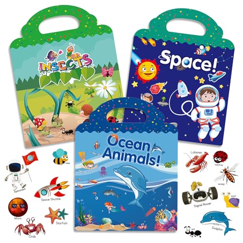 Klistermärkesböcker för barn, återanvändbar klistermärkesbok för 2, 3, 4, 5 år gamla flickor, pojkar, presenter, 3 set pedagogiska inlärningsleksaker, utomhusreseleksaker för småbarn, Montessori-leksaker