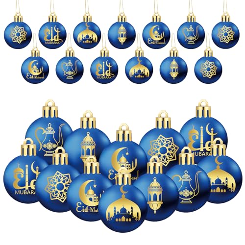 Bememo 24 Pcs Eid Ball Ornaments for Tree Eid Al Adha Decoration1.57 Inches Plastic Ramadan Hanging Ornaments Islamic Moon Star Ball Ramadan Decor for Holiday Tree Party Decoration(Blue and Gold)