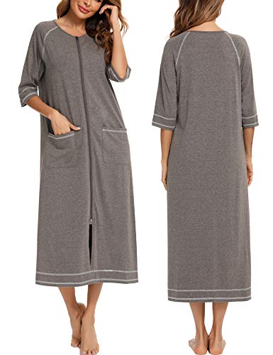 Veseacky Dam morgonrock med dragkedja framtill bomull husklänning kortärmad husrock full längd nattlinne (grå, XXL), Grå, XXL