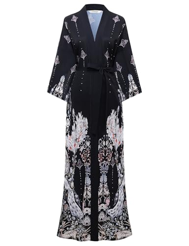 Lovasy kimono morgonrockar satin kimono rock påfågel och blommor silke morgonrock för kvinnor UK lång siden brud och brudtärna morgonrock, B-svart, XL