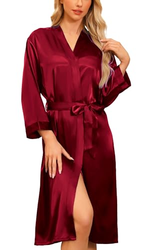 Sopesil satinbadrock för kvinnor, unisex, satin, badrock, kimono, v-ringad, morgonrock för spa, hem och hotell S–XXL, röd, L