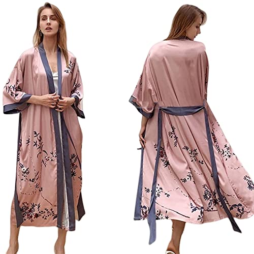 BABEYOND Dam morgonrock maxi lång satin sommar kimono blommor mönster tryckt badrock kimono cardigan damer lång rock blommor sovkläder flicka pyjamas party, Stil2 – rosa, One Size /L